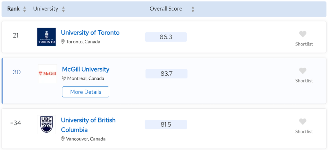 Canada consistently features in the QS World University Rankings. In 2024, three Canadian universities ranked among the top 50 worldwide:
